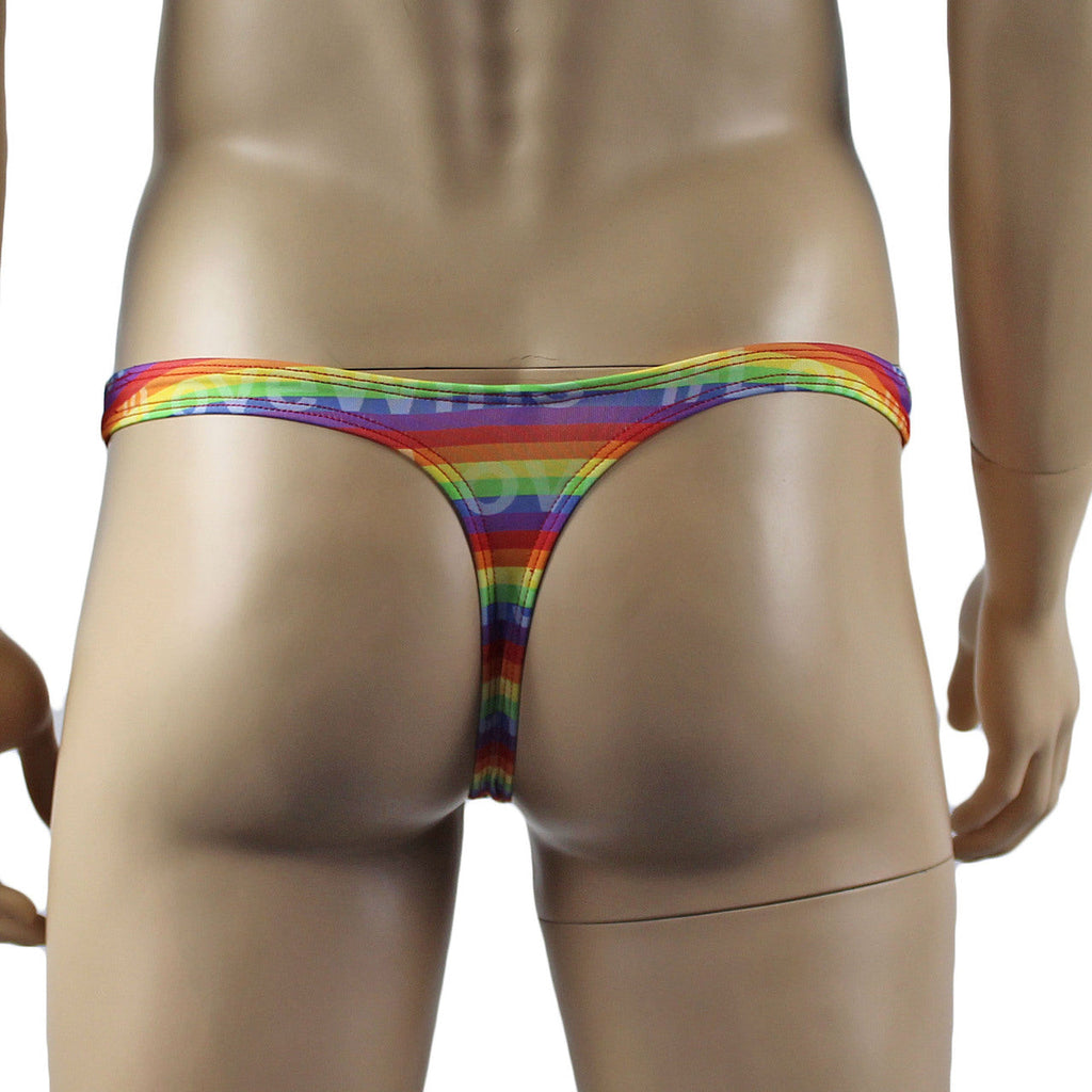 Mens stretch spandex lycra gay pride flag design G string Thong with #LoveWins print, has pouch front and elasticized waist and legs
