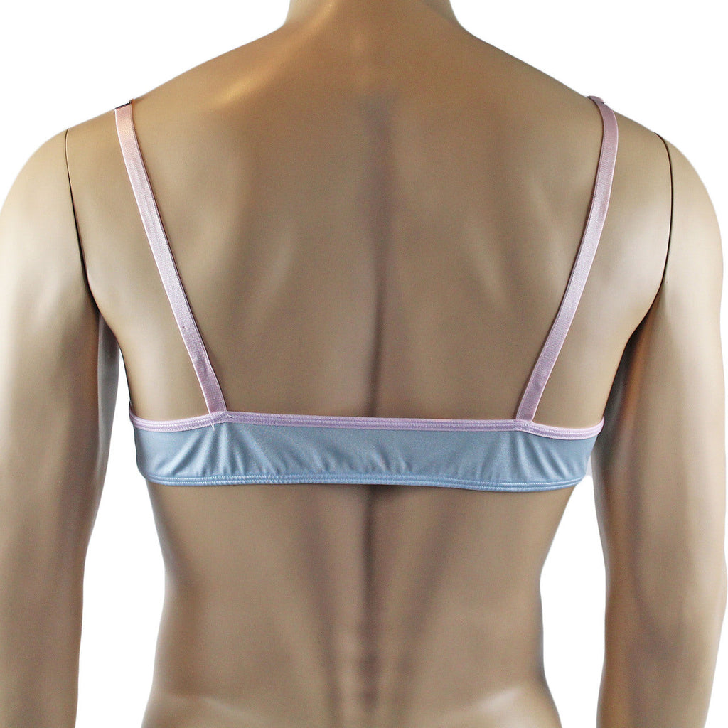 Mens stretch soft spandex Bra Top for the male form, it has a slightly contoured front but not busty for men, a deep V front to enhance a cleverage look, floral lace trim overlay, adjustable shoulder straps and satin bow front. Step into, or slip over your head to wear.