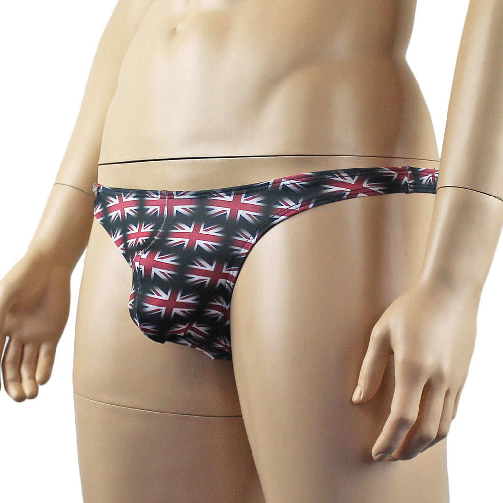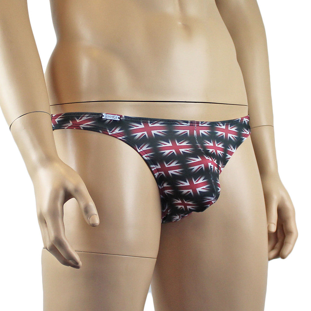Mens stretch UK British printed spandex low waisted mini Thong with contoured bulge pouch front and a very sexy V back. Wear to a festival, party or in the swimming pool